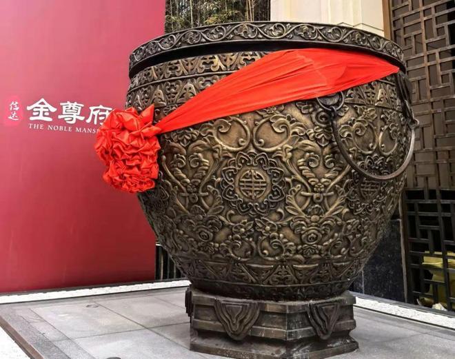 比如,小区大门口福地之上摆放的两尊聚宝盆,重达1.5吨,纯铜定制的镇宅之宝,刻画着五福捧寿图样,寓意上好。